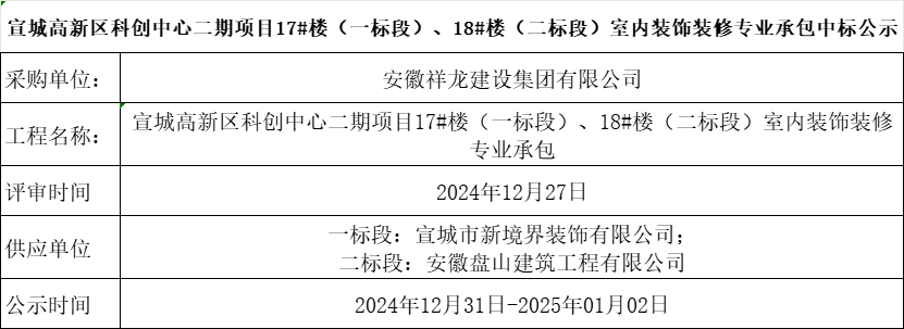 宣城高新區科創中心二期項目17#樓(一標段)、18#樓(二標段)室內裝飾裝修專業承包中標公示